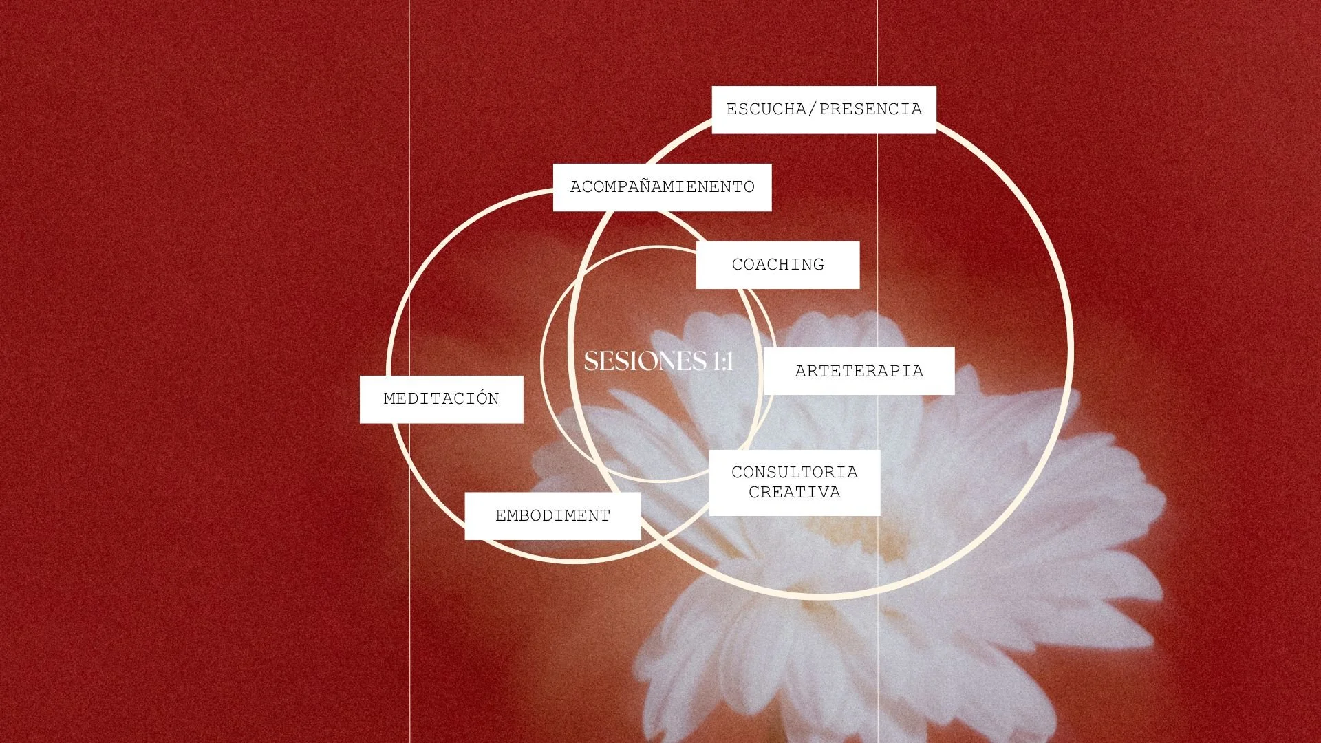 Cada encuentro es un espacio de escucha y creación, diseñado con presencia y sensibilidad, creando sesiones de forma personalizada, cuidada y estratégica a las necesidades específicas de cada acompañamiento.